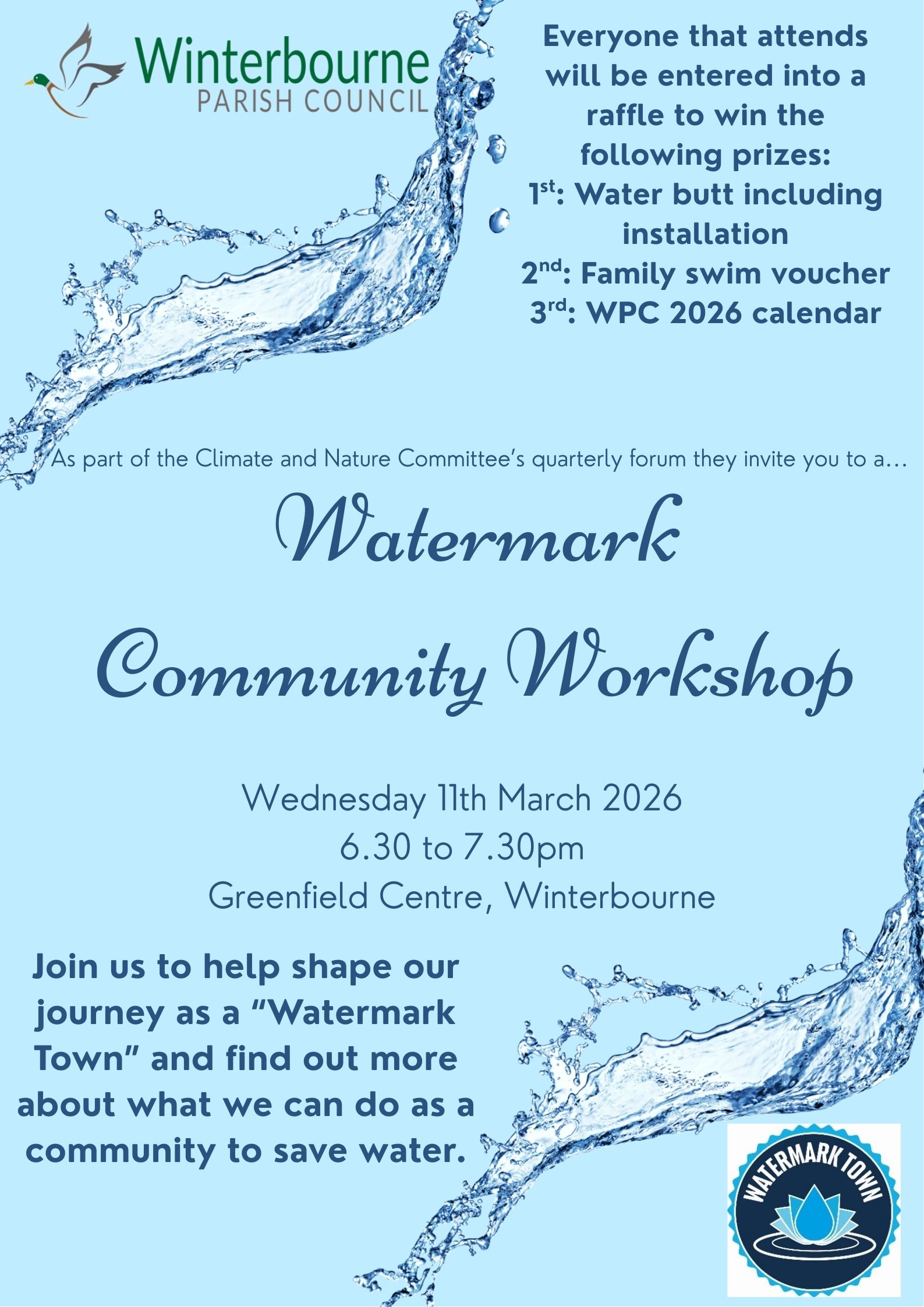 Join us for our quarterly Climate and Nature Forum which includes a Watermark Workshop where you can help shape our journey as a “Watermark Town” and find out more about what we can do as a community to save water.