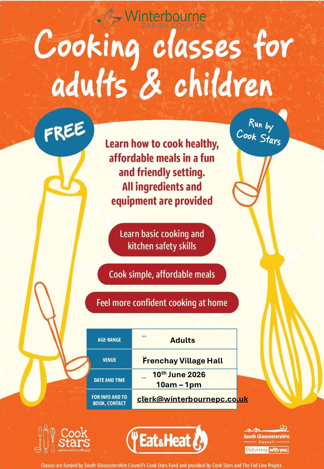 Winterbourne Parish Council are excited to be able to provide this Free event for ADULT Parishioners of the Parish to come and enjoy a cooking session ran by Cookstars.