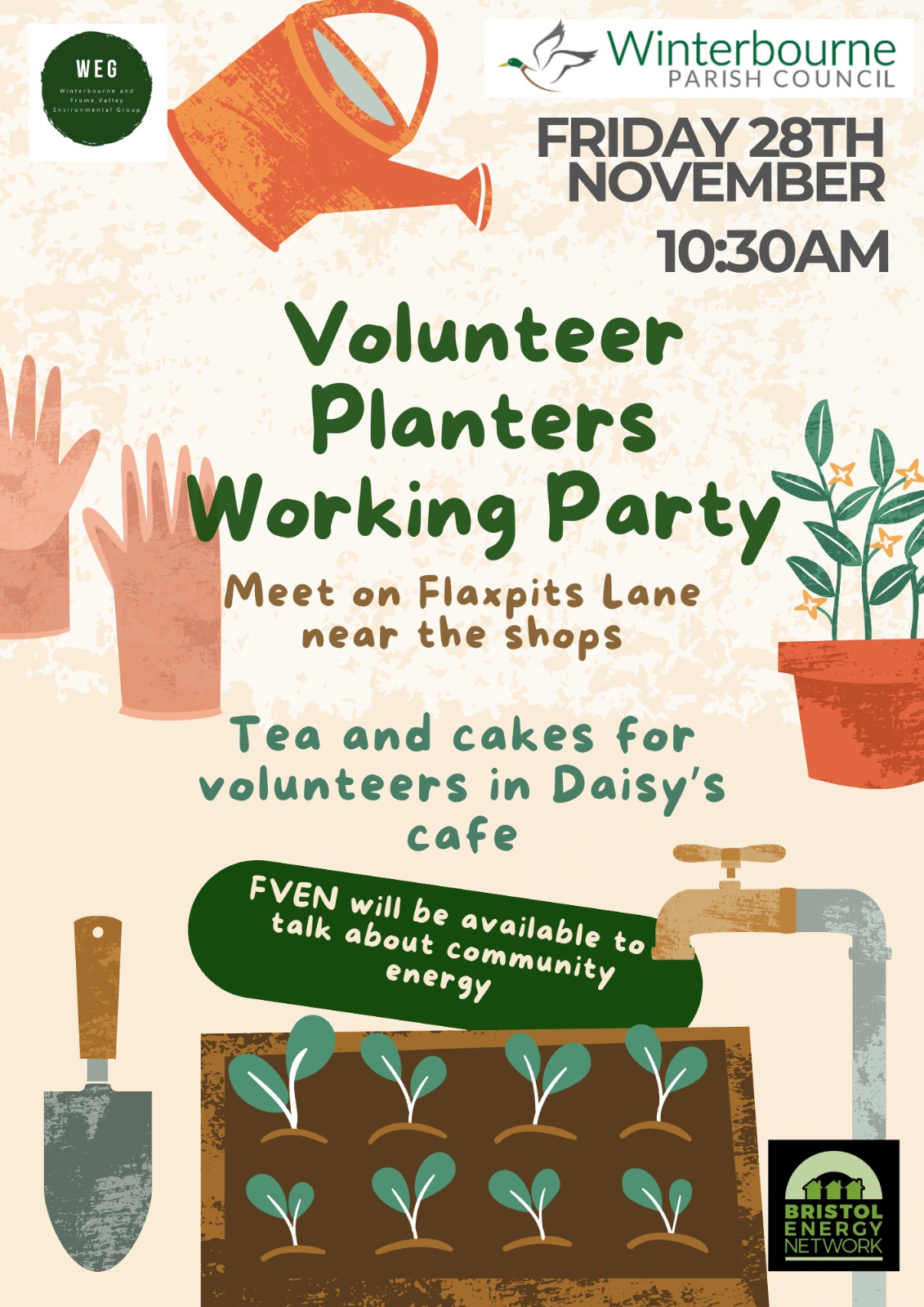 Please join us to help tidy and plant new plants and bulbs in the planters at Flaxpits Lane. Followed by free tea/coffee and cake from Daisy's thanks to funding from Winterbourne and Frome Valley Environmental Network.