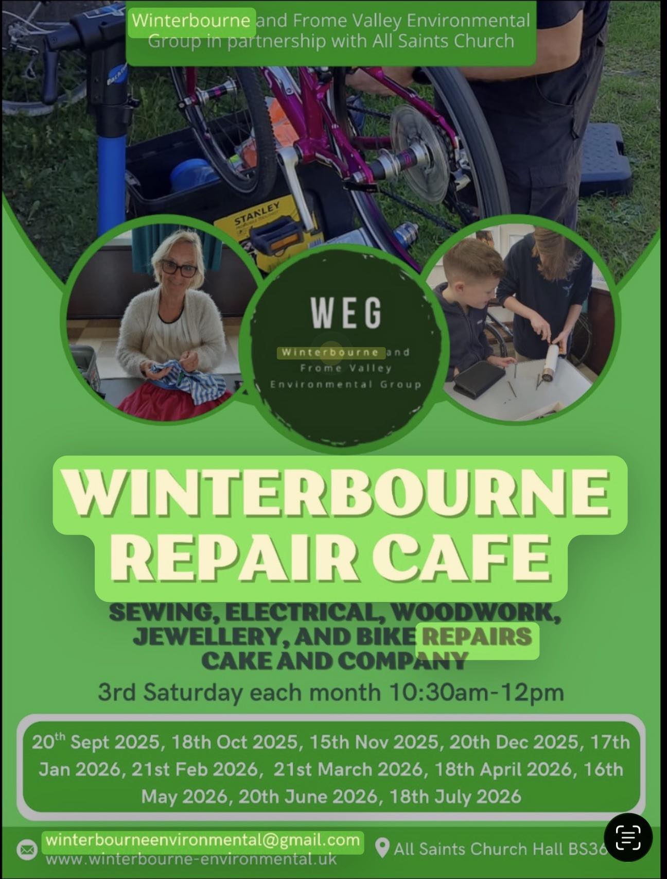 Frome Valley Environmental Network host the Winterbourne Repair Cafe at All Saint's Church Hall in Winterbourne Down.