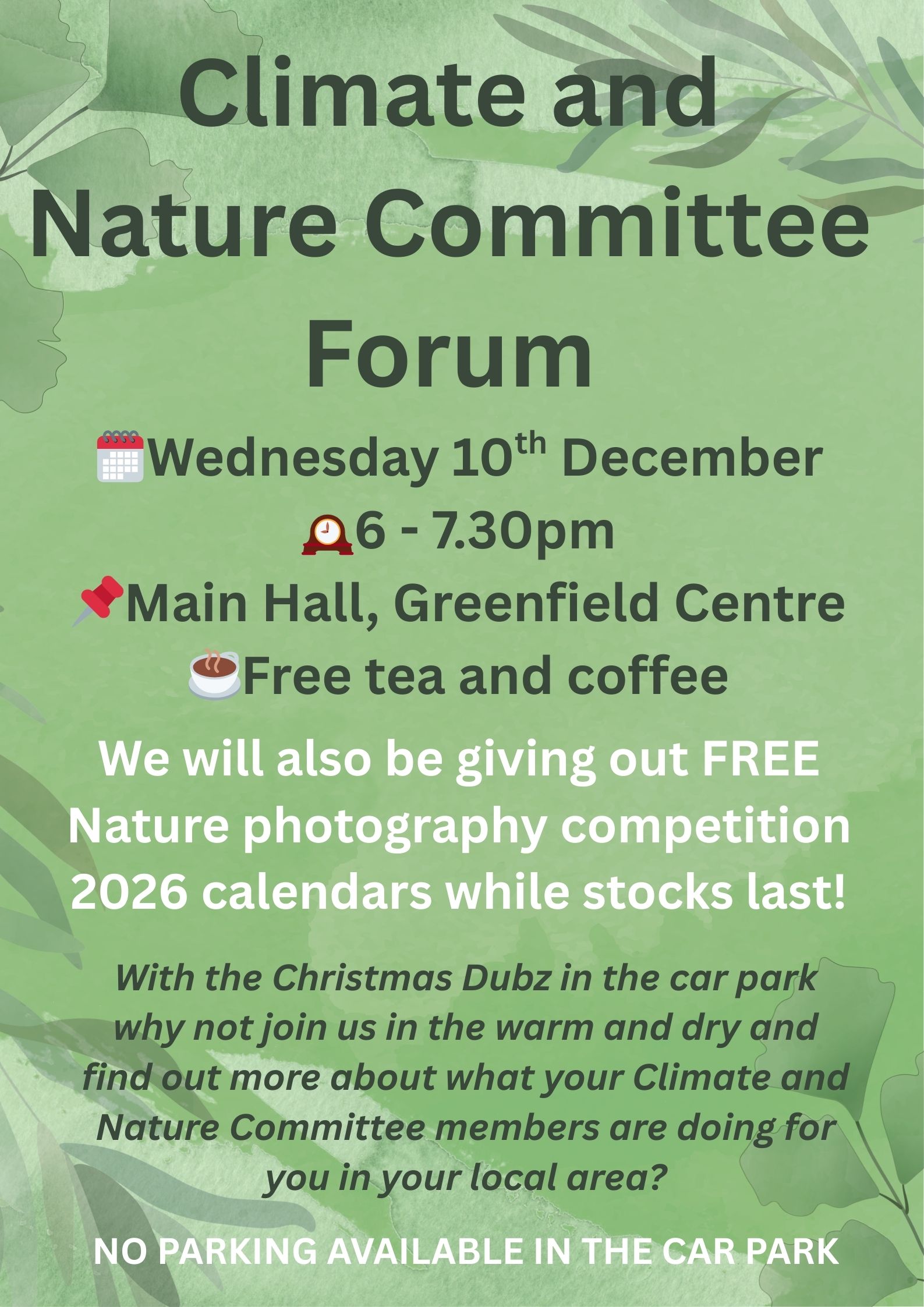 Whilst you're in the Greenfield Centre car park enjoying the festivities with the Christmas Dubz please come and speak to your Climate and Nature Committee members in the main hall.