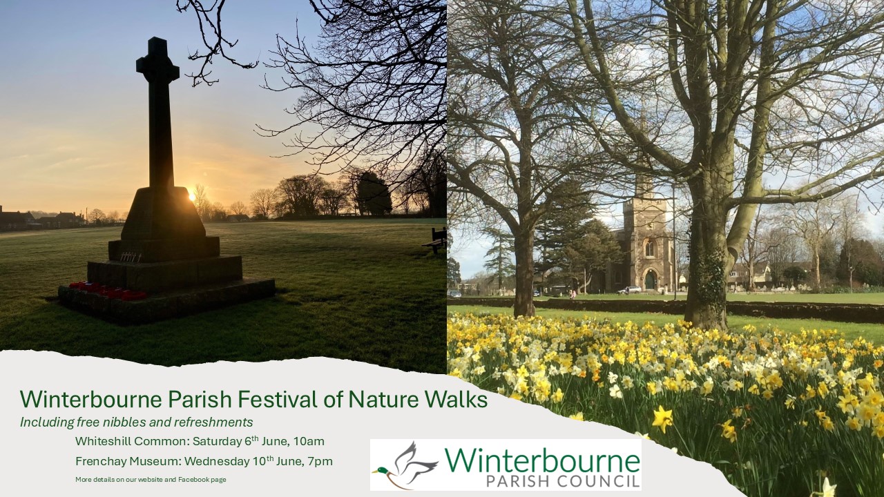 Winterbourne Parish Council are hosting two free guided nature walks as part of the Festival of Nature. Both walks include free nibbles and refreshments and a complimentary leaflet showing details of other walks/green spaces within the parish.