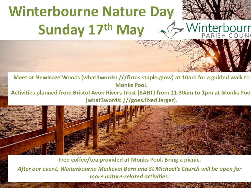 After our event, Winterbourne Medieval Barn and St Michael’s Church will be open for more nature-related activities.